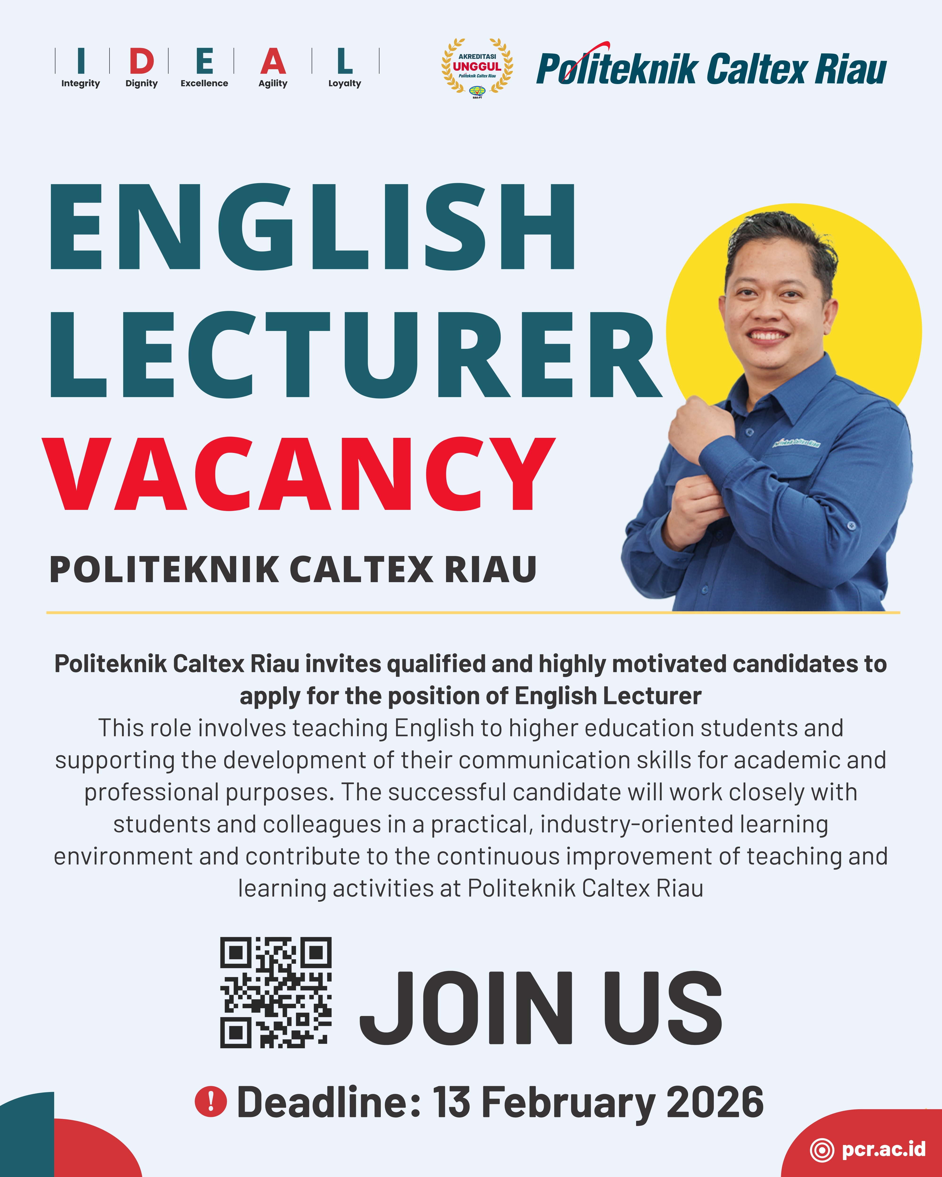 Politeknik Caltex Riau invites qualified and highly motivated candidates to apply for the position of English Lecturer This role involves teaching English to higher education students and supporting the development of their communication skills for academic and professional purposes. The successful candidate will work closely with students and colleagues in a practical, industry-oriented learning environment and contribute to the continuous improvement of teaching and learning activities at Politeknik Caltex Riau